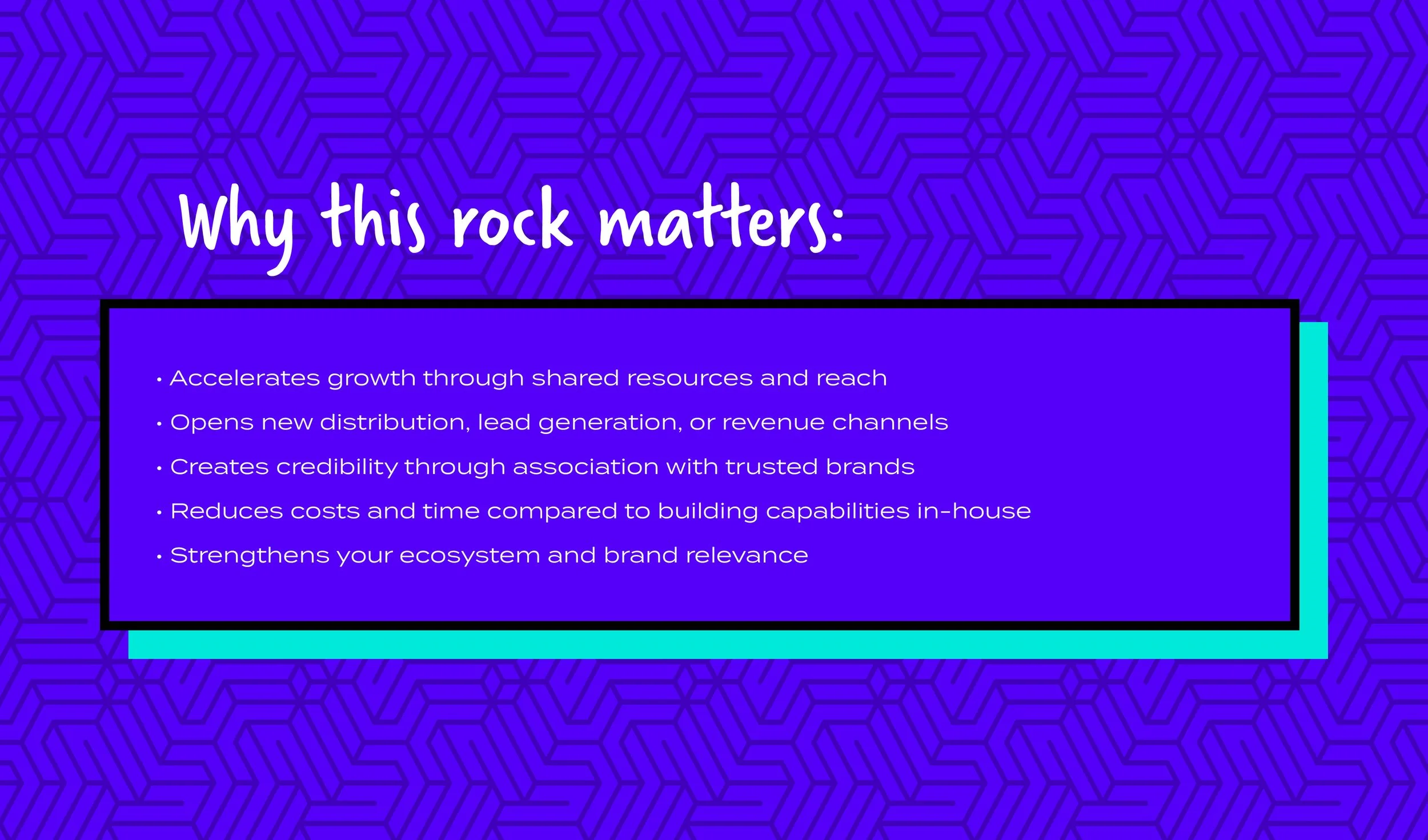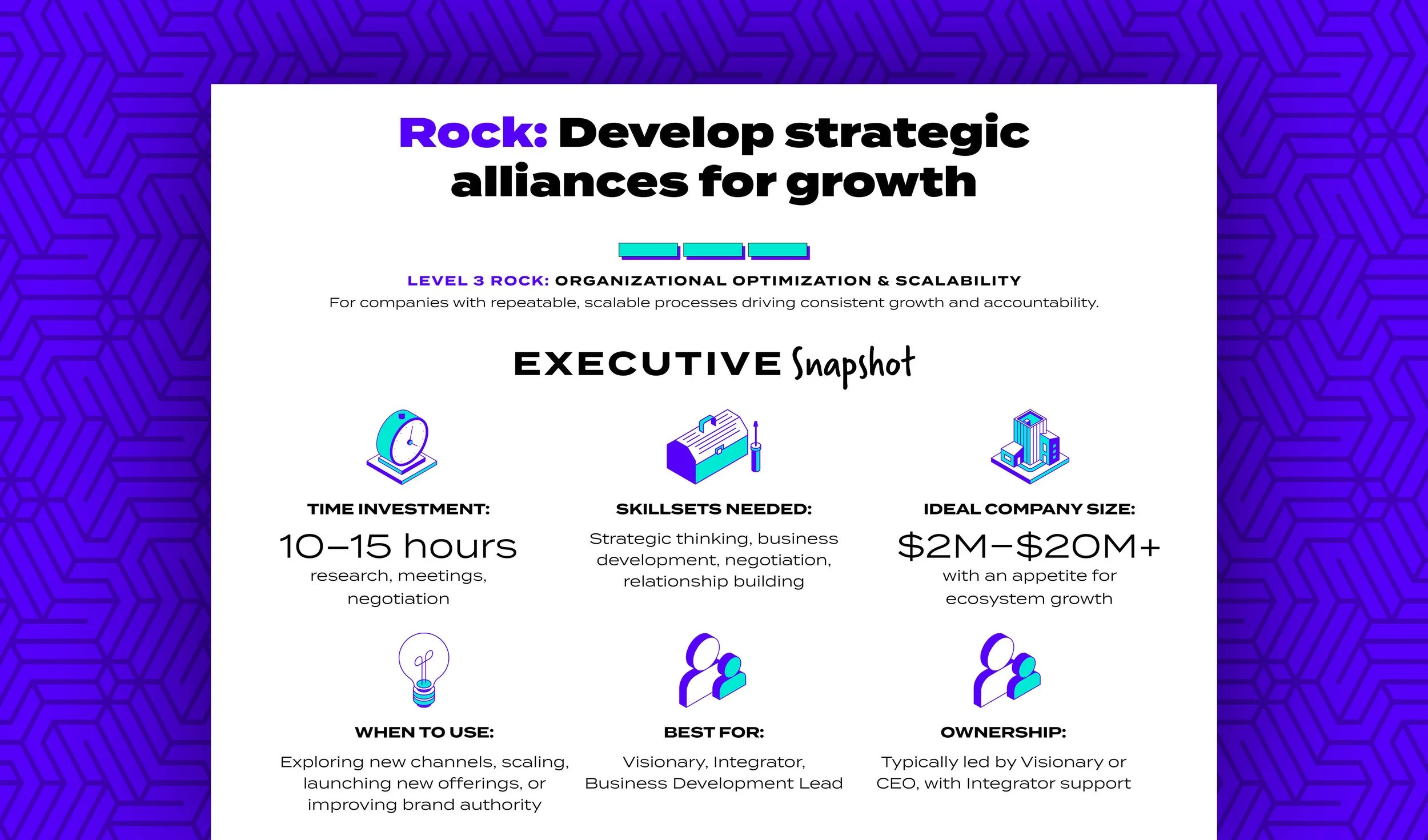 Pursue and secure strategic alliances that enhance your market position, reach new customer segments, or increase operational efficiency. This Rock helps you build the right partnerships to scale faster and smarter.