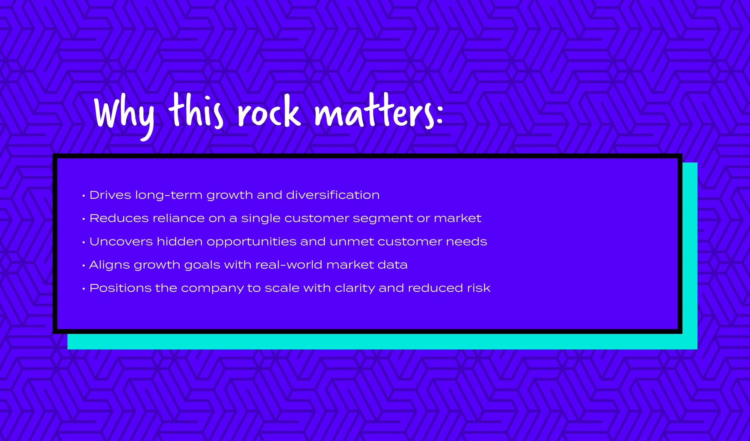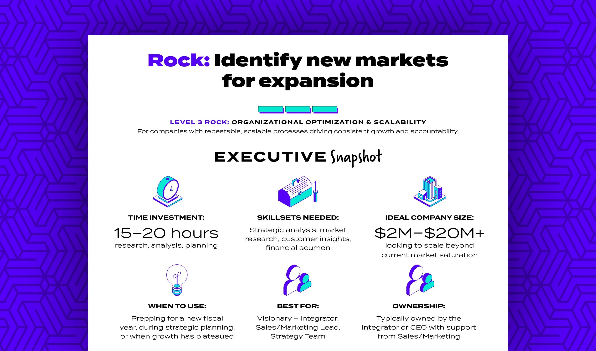 Explore, evaluate, and validate potential new markets for your business to expand into. This Rock sets the foundation for sustainable growth by focusing on market fit, opportunity size, and go-to-market strategy.