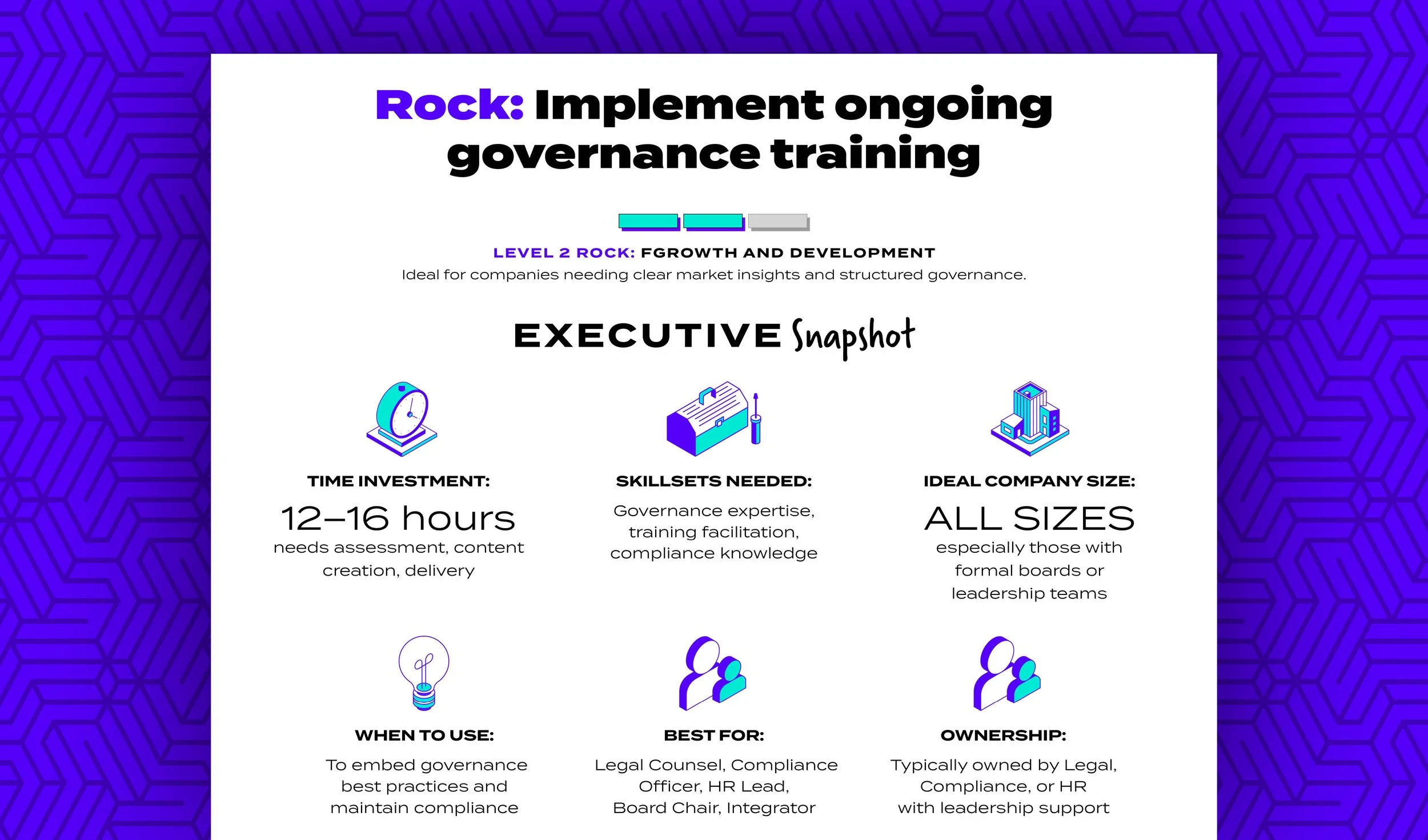 Develop and sustain an ongoing governance training program to educate leadership and board members on bylaws, compliance, risk management, and ethical standards, ensuring effective governance and organizational integrity.